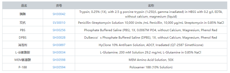 除了以上的經(jīng)典培養(yǎng)基和血清以及工業(yè)培養(yǎng)基等產(chǎn)品,HyClone的PBS、胰酶、雙抗以及消泡劑等也都是備受歡迎哦。部分產(chǎn)品清單如下: